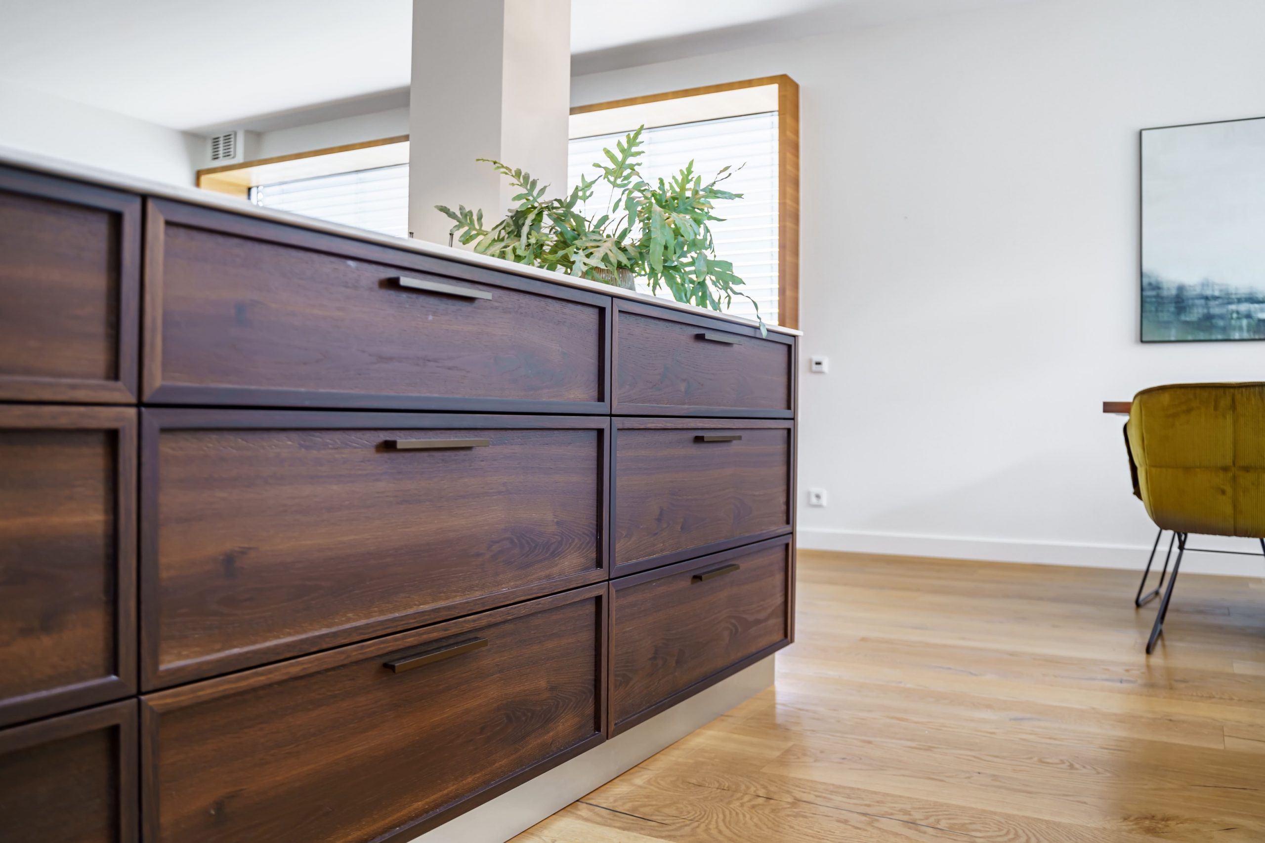Das Design besticht durch die Verwendung von dunklem Holz, dessen warme Töne in Kombination mit klaren Linien eine zeitgemäße Ästhetik schaffen. Die bewusst reduzierte Farbpalette in neutralen Nuancen trägt zu einer ruhigen und harmonischen Atmosphäre bei.