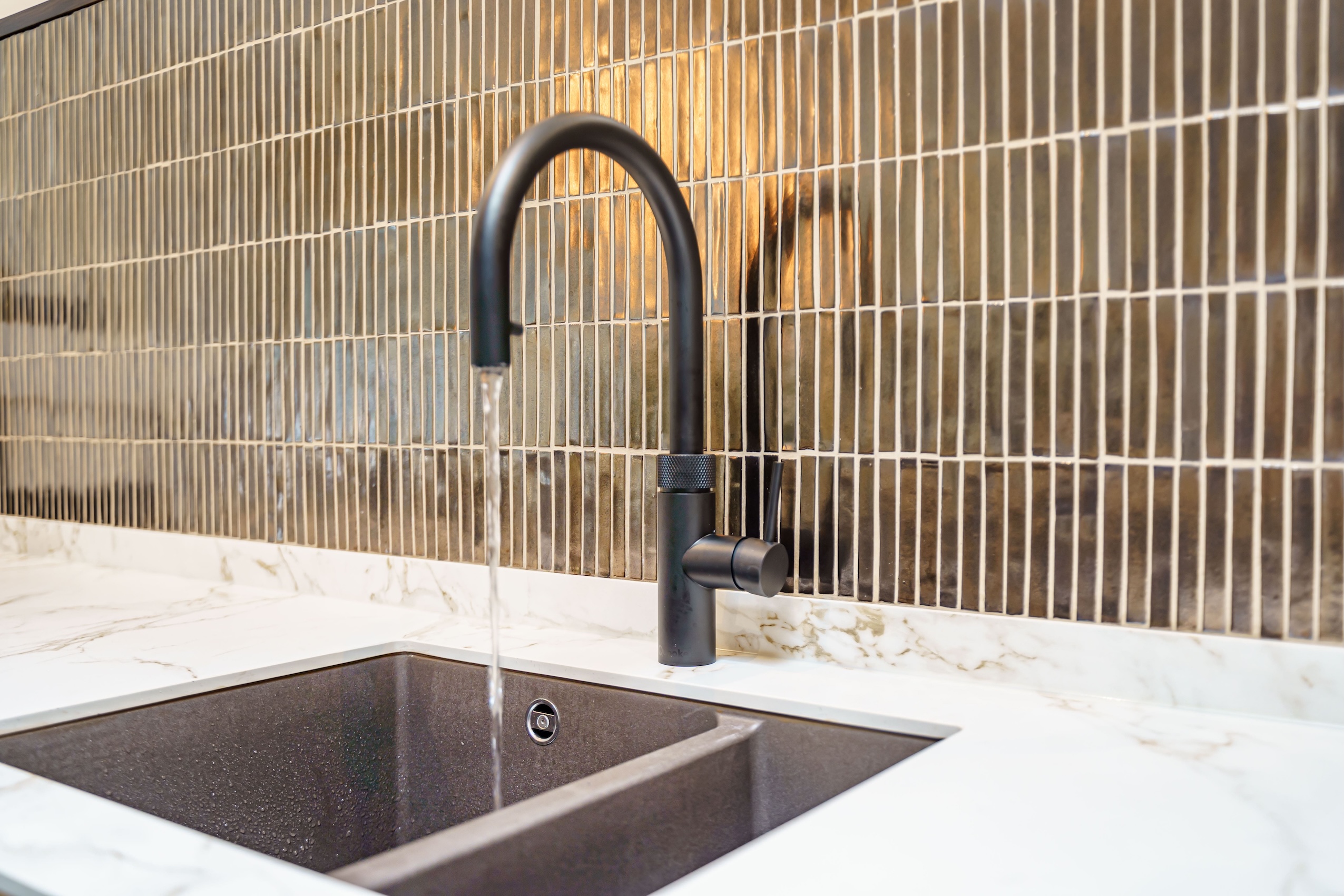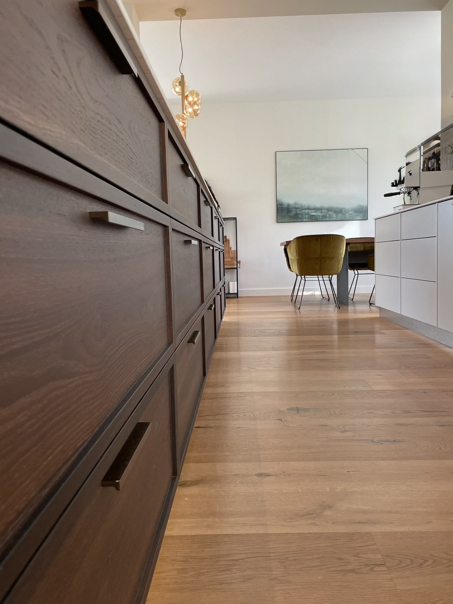 Ein besonderer Blickfang ist die Rückwand aus bronzefarbenen Fingerfliesen, die dem Raum nicht nur eine faszinierende Textur verleiht, sondern auch einen warmen, einladenden Glanz ausstrahlt. Die Arbeitsplatte aus Dekton, einer innovativen ultrakompakten Porzellanoberfläche aus einer Mischung von Glas, Keramik und Quarz, besticht durch ihre elegante Marmorstruktur und unterstreicht die hochwertige Gesamtanmutung. Gezielte Lichtakzente setzen die Küche perfekt in Szene und machen sie zu einem einladenden Mittelpunkt des Raumes, der Funktionalität und Ästhetik meisterhaft vereint.