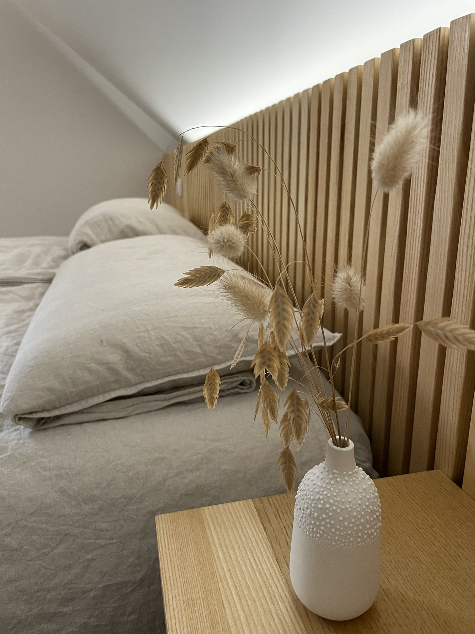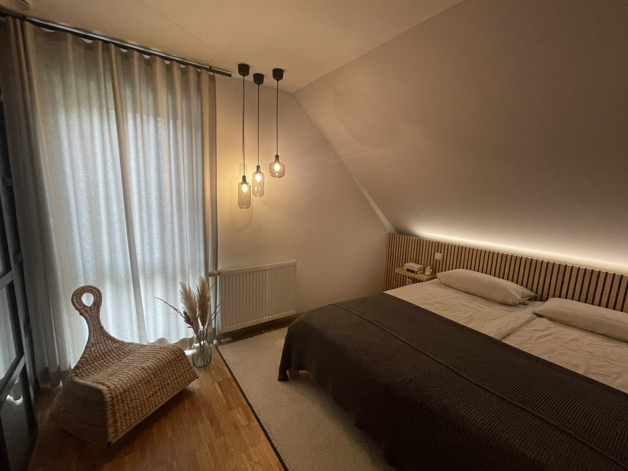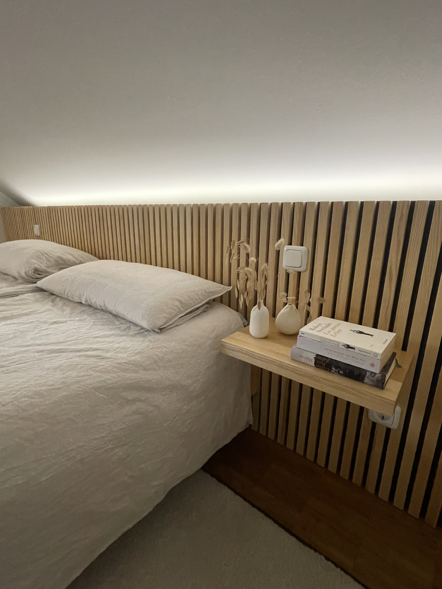 Wir haben die Schräge in einem dunkleren Ton gestrichen damit etwas mehr „Kuschel – Atmosphäre“ einzieht. Das Bett inkl. Rückwand und indirekter Beleuchtung wurde durch sROOMS geplant, der Hausherr hat es selbst umgesetzt.