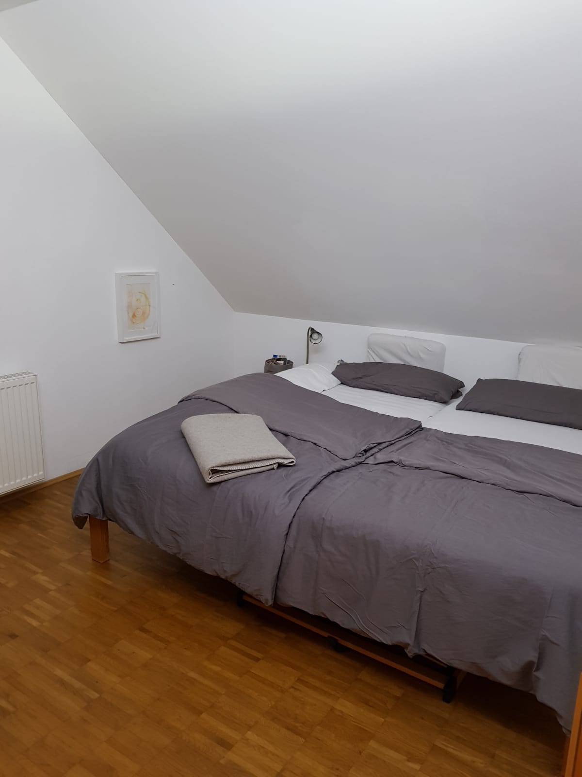 Ein Schlafzimmer mit Dachschräge.